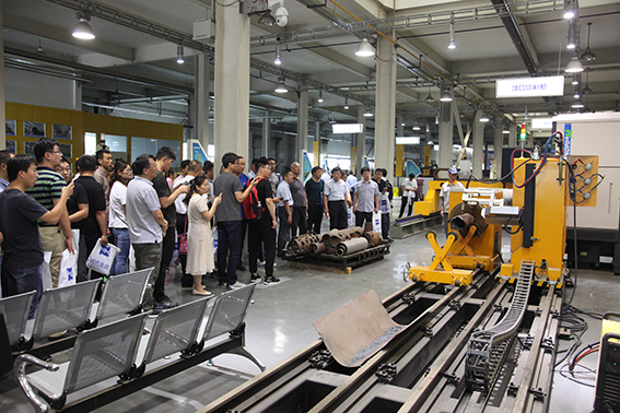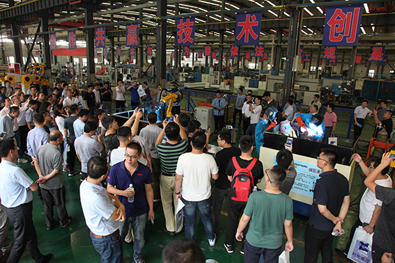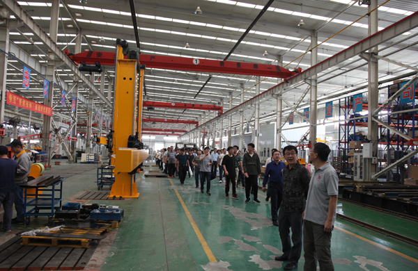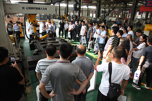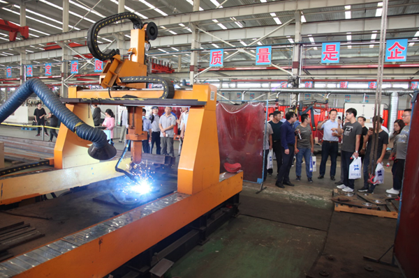 會議第一天的下午,全體代表乘車來到山東時代新紀元機器人有限公司及北京時代濟南焊接工業園參觀。時代機器人公司同仁為各位代表展示了機器人焊接技術在典型結構件焊接中的應用實例。時代展示的產品包括:相貫線管道焊接機器人、200公斤雙軸變位機配8軸聯動相貫線焊接機器人、車廂板焊接機器人、鋁合金焊接機器人等。產品展示中還安排了人工焊接與機器人焊接的競賽吸引眾多代表圍觀,最終機器人方以工作速度快,焊縫成形美觀等優勢勝出。在時代焊接工業園,各位代表參觀了時代自動焊設備生產線及焊機裝配生產線,同時還觀看了時代自動焊割設備表演。通過現場參觀和溝通。專家們對時代產品有了更加全面的了解和認識。同時,他們期待著與時代公司在特種設備焊接技術方面進行更深入和更廣泛的交流及合作。