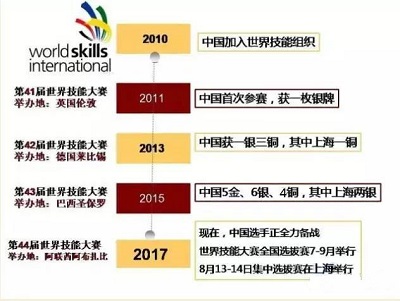 201710月,第44屆世界技能大賽將在阿聯酋阿布扎比舉行,中國代表隊擬參賽項目共45個。20167月至9月,第44屆世界技能大賽全國選拔賽全面拉開帷幕。813日至14日,將在上海世博展覽館1號館舉行全國選拔賽集中選拔賽!