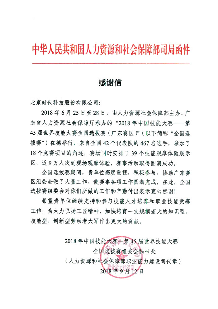| 2018-09 | 第45屆世界技能大會全國選拔賽 組委會感謝信 | 中國人力資源和社會保障部職業能力建設司 |